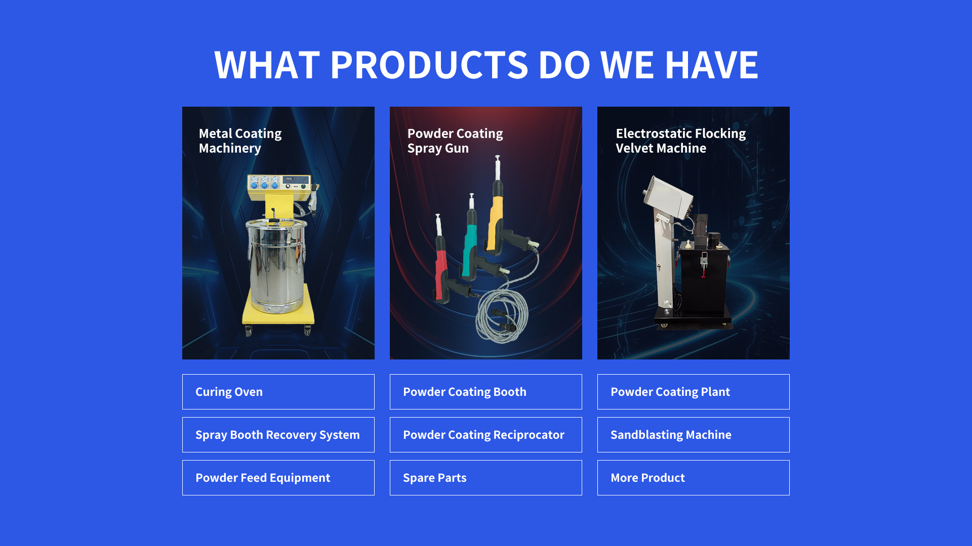 Powder Coating Equipment applies a dry, electrostatic-charged powder to metal surfaces, which is then cured for a durable finish. Key components include a spray gun (e.g., Gema OptiSelect with automatic voltage adjustment), powder hopper, electrostatic generator (0–100 kV output), recovery system(up to 99.2% efficiency), and curing oven.